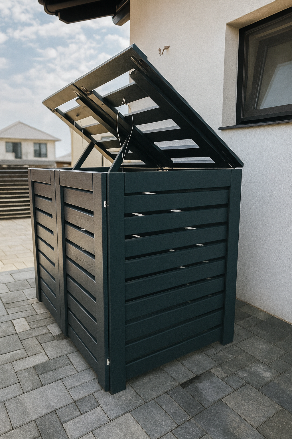 Cu un design modern și finisaje atent lucrate, cutiile noastre oferă o soluție practică și estetică pentru ascunderea tomberoanelor, echipamentelor tehnice sau altor elemente din curte.